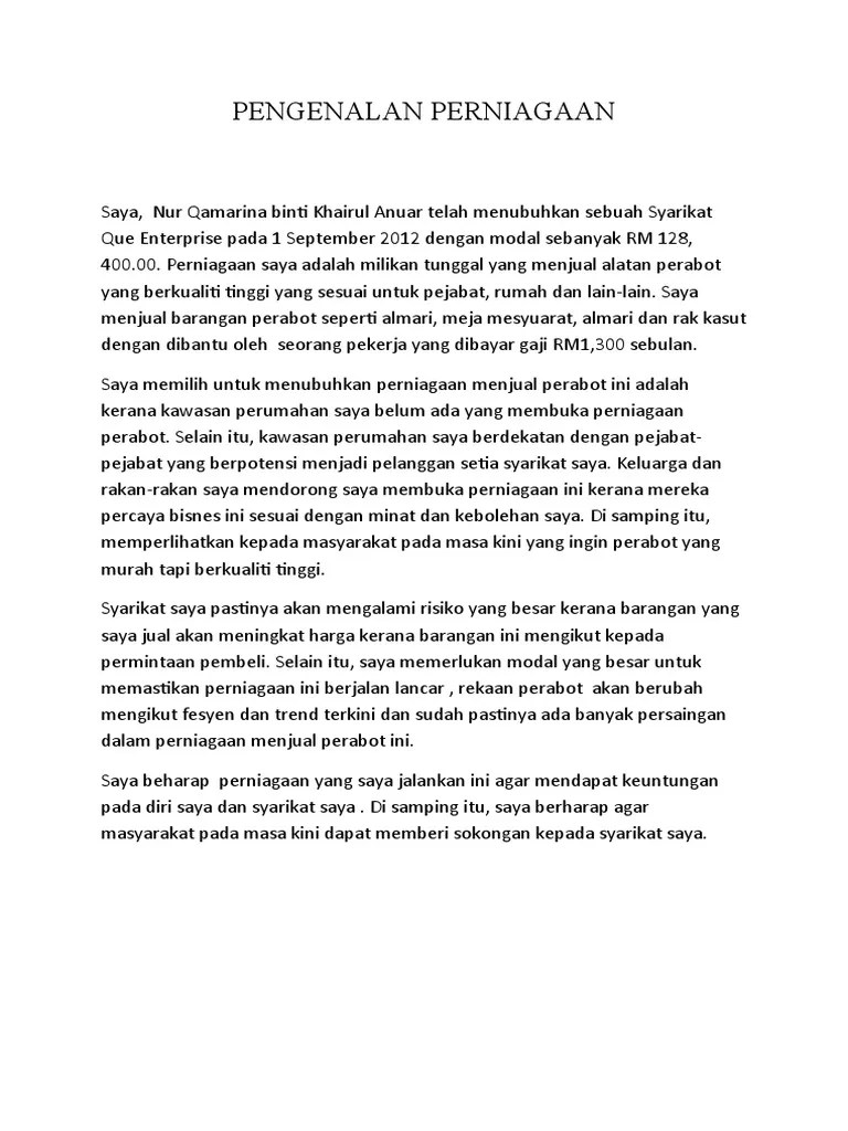 Perkongsian mungkin wujud di antara. Korang boelh je guna nama macam dalam kad pengenalan. Perniagaan saya ini merupakan sebuah perniagaan milikan tunggal dengan modal sebanyak rm 80,000 ,rm 60,000 di bank dan rm 20, 000 di tangan.